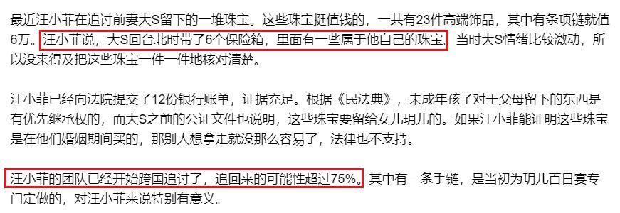 此前就有传大S回台北时带了6个保险箱,里面有一些属于汪小菲自己的珠宝。当时大S情绪比较激动,所以没来得及把这些珠宝一件一件地核对清楚。