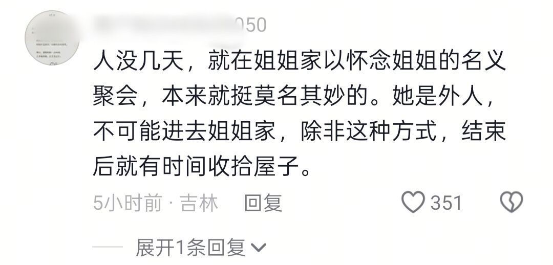 有人这样说道:“大S去世没几天,小S以怀念姐姐的名义在豪宅里邀请一众闺蜜聚会,本来这种行为就有些莫名其妙,待聚会结束后就有时间收拾屋子了。”